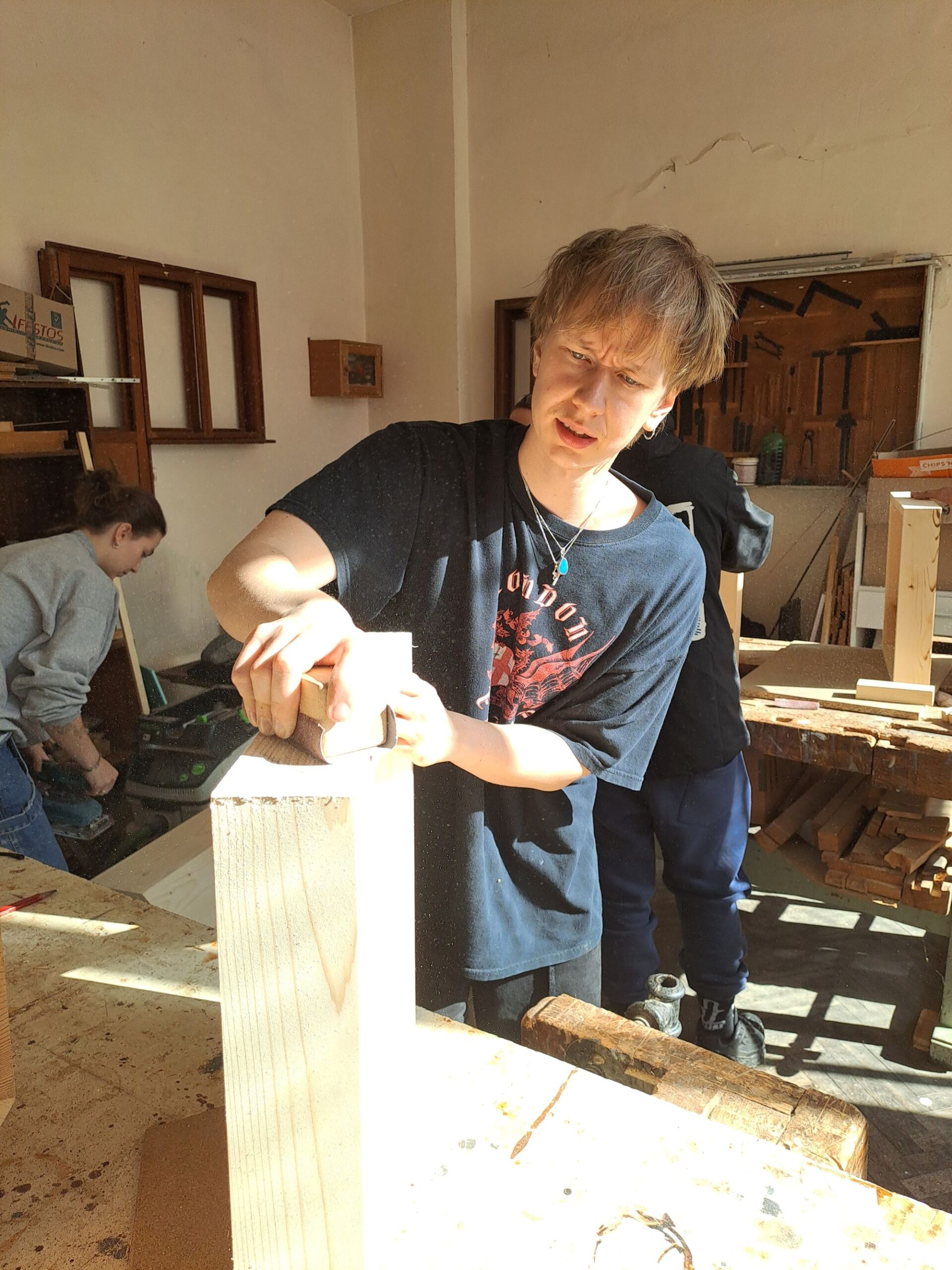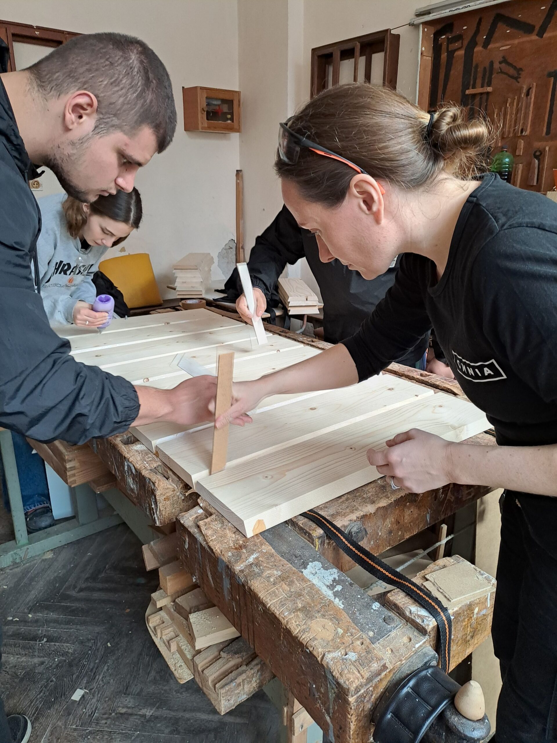 The week began at the Hristo Botev Professional High School of Architecture and Woodworking. The school was a very traditional Bulgarian school, where political history and traditions were very much present. The school had a strong tradition of woodworking, and the workshop had a wide range of woodworking machines. The workshop also had a CNC machine and a laser cutter. Teaching was mainly based on customer projects, with the teacher playing the leading role and the students participating in the work process. As in the previous week, we formed five groups of two students, with one of our students paired with one local student.